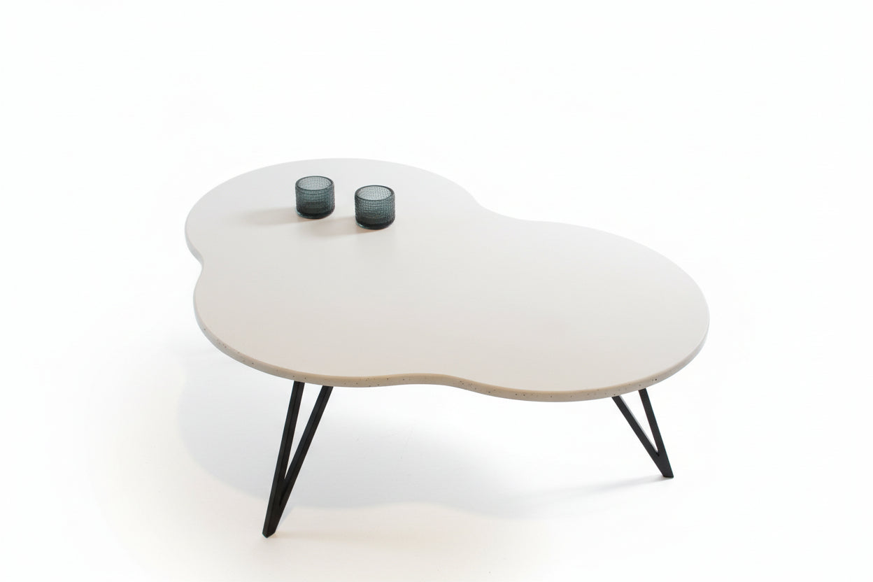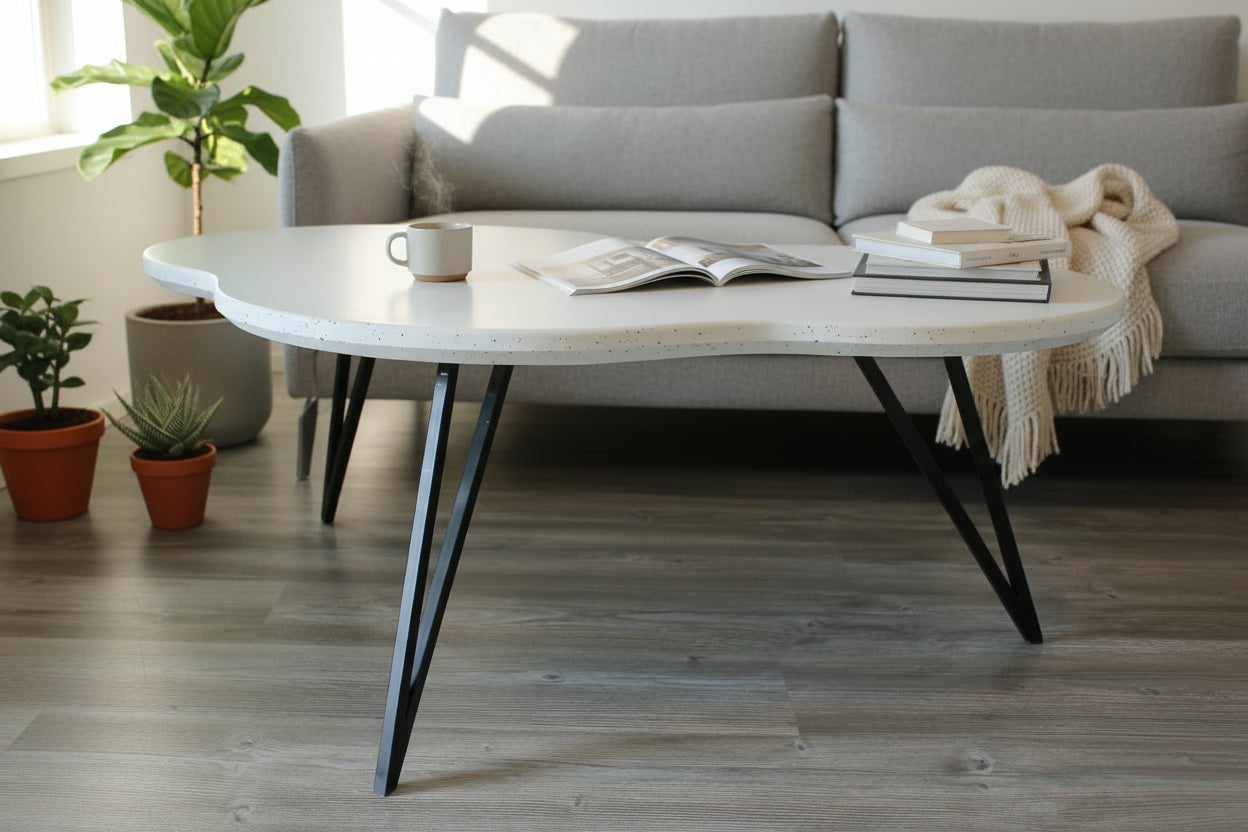 Betonisohvapöytä valkoisella kannella ja mustilla metallijaloilla